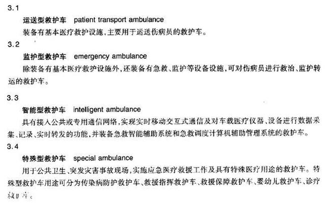 國家質(zhì)量監(jiān)督檢驗(yàn)檢疫總局發(fā)布的GB/T 17350-2009《專用汽車和專用掛車術(shù)語、代號和編制方法》、工信部2014年3月1日實(shí)施的QC/T 457-2013《救護(hù)車》、衛(wèi)生部2008年4月1日實(shí)施的WS/T 292-2008《救護(hù)車》,都對救護(hù)車有著各自的定義。