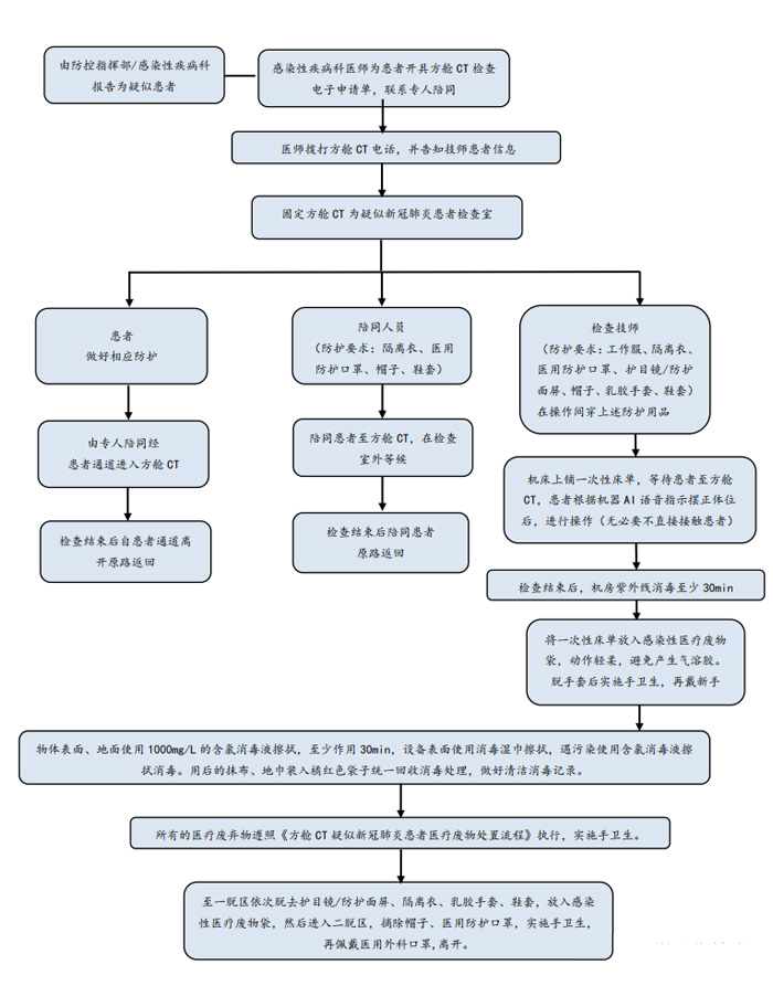 除X線電離防護(hù)外,方艙CT檢查需對操作技師、患者及家屬做相應(yīng)的防護(hù)。根據(jù)國家衛(wèi)生健康委辦公廳印發(fā)的《新型冠狀病毒肺炎防控方案》(第五版)[6]對于在新型冠狀病毒感染的肺炎疫情防控工作中不同的工作人員其防護(hù)等級是不同的。如是疑似患者,技師則執(zhí)行二級防護(hù)。方艙CT內(nèi),設(shè)置清潔區(qū)、一脫區(qū)、二脫區(qū)、免洗手消毒液、一次性防護(hù)服、一次性乳膠手套、鞋套、洗手液。技師需經(jīng)多次反復(fù)訓(xùn)練穿脫流程和檢查流程,并做好總結(jié),考察合格方可上崗。為此我科花費了大量時間進(jìn)行了防護(hù)用品穿脫,消殺,接診流程的演練,并做總結(jié)和改進(jìn)措施。(附件1所示),防護(hù)用品穿脫流程如圖2所示。