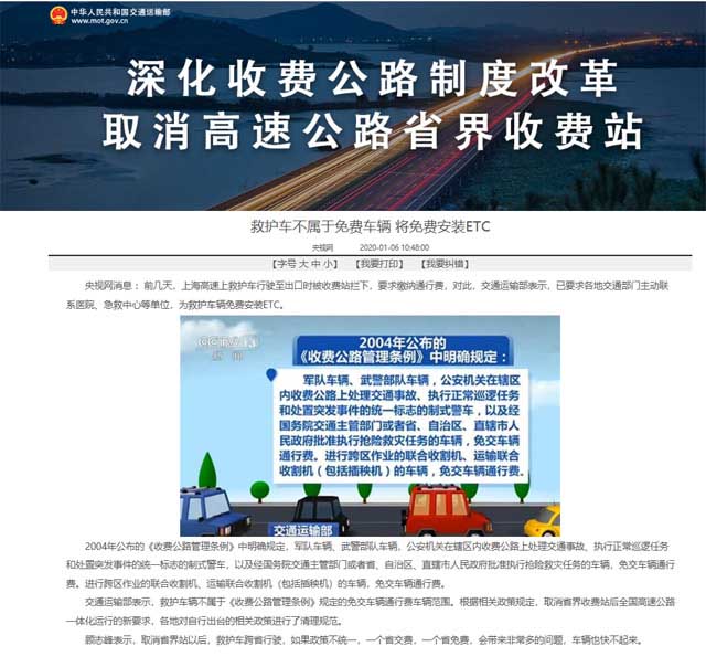 報道稱: 央視網(wǎng)消息 :前幾天,上海高速上救護車行駛至出口時被收費站攔下,要求繳納通行費,對此,交通運輸部表示,已要求各地交通部門主動聯(lián)系醫(yī)院、急救中心等單位,為救護車輛免費安裝ETC。 2004年公布的《收費公路管理條例》中明確規(guī)定,軍隊車輛、武警部隊車輛,公安機關(guān)在轄區(qū)內(nèi)收費公路上處理交通事故、執(zhí)行正常巡邏任務(wù)和處置突發(fā)事件的統(tǒng)一標志的制式警車,以及經(jīng)國務(wù)院交通主管部門或者省、自治區(qū)、直轄市人民政府批準執(zhí)行搶險救災(zāi)任務(wù)的車輛,免交車輛通行費。進行跨區(qū)作業(yè)的聯(lián)合收割機、運輸聯(lián)合收割機(包括插秧機)的車輛,免交車輛通行費。 交通運輸部表示,救護車輛不屬于《收費公路管理條例》規(guī)定的免交車輛通行費車輛范圍。根據(jù)相關(guān)政策規(guī)定,取消省界收費站后全國高速公路一體化運行的新要求,各地對自行出臺的相關(guān)政策進行了清理規(guī)范。 顧志峰表示,取消省界站以后,救護車跨省行駛,如果政策不統(tǒng)一,一個省交費,一個省免費,會帶來非常多的問題,車輛也快不起來。